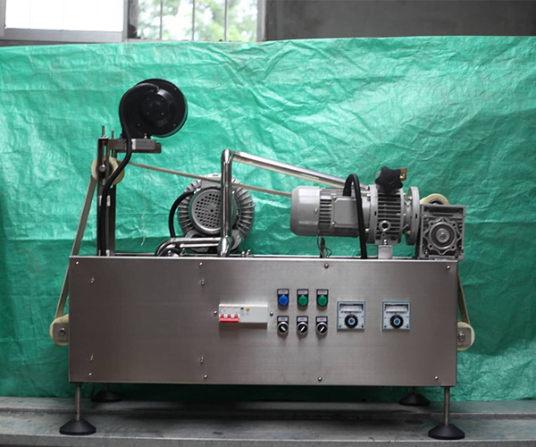 該機是通過電熱管加熱收縮室,再經吹風機送風,使熱收縮室溫度均勻,當帶膠帽的瓶子從熱收縮室內通過時,膠帽收縮而裹緊瓶口,以達到良好的收縮目的。